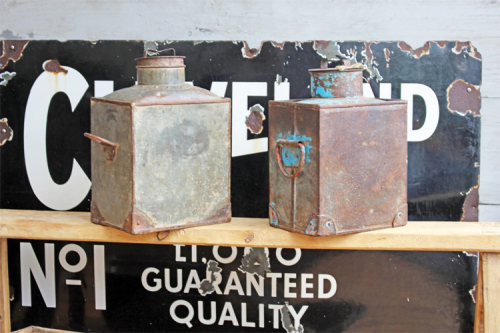 Zwei alte Metall Kanister zur Verwendung für Benzin oder Petroleum.